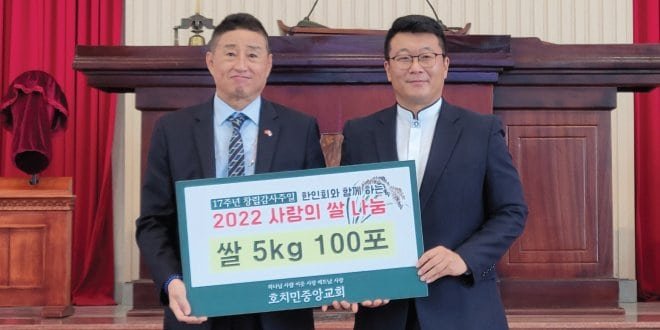 2022년10월30일 오전11시 베트남한인회총연합회 겸 호치민한인회 손인선 회장과 홍승표 상근부회장, 김대성 국장은 고밥군에 위치한 호치민중앙교회 창립 제17주년 기념예배에 참석하였다. 손인선 회장은 호치민중앙교회 창립 제17주년에 대한 축사를 하고 호치민중앙교회에서 호치민한인회에 기증하는 사랑의 쌀 500kg 증정식을 가졌다. 이에 손인선 회장은 귀한 정성으로 기증해주신 사랑의 쌀을 불우한 이웃들에게 골고루 나눠드리도록 최선을 다하겠다고 감사의 뜻을 전하였다. 한편 호치민한인회는 교민들 중 생활이 어려운 분들을 우선 파악하여 12월 중 기증받은 사랑의 쌀을 나눠드릴 예정이다.