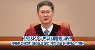 헌법재판소가 4일 윤석열 대통령에 대한 탄핵소추를 인용해 파면 결정을 내렸다고 연합뉴스가 4일 긴급속보로 보도했다. 문형배 헌재소장 권한대행은 이날 오전 11시 22분께 대심판정에서 “윤석열 대통령을 파면한다”는 탄핵심판 선고 주문을 읽었다. 파면의 효력은 즉시 발생해 이를 기점으로 윤 대통령은 직위를 잃었다. 이는 윤 대통령이 지난해 12월 3일 비상계엄을 선포한 때로부터 122일 만이며, …