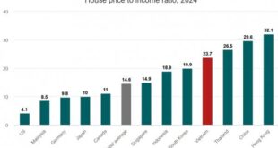 -소득대비 집값 아시아 4위 기록….내집마련에 23.7년- 지난해 베트남의 소득대비 집값이 동남아에서 2번째로 높았던 것으로 조사됐다고 인사이드비나지가 24일 보도했다. 이날 가격비교 플랫폼 넘베오(Numbeo)에 따르면, 작년 베트남의 가구소득대비 주택가격비율(HPR)은 23.7배를 기록했다. HPR은 세계은행(WB)과 유엔(UN) 등 국제기구가 주택구매 능력을 측정하기 위해 권고하는 지표중 하나로, 중위 주택가격에 가구중위소득을 나눈 값으로 산출된다. HPR이 10이면 중위소득 가구가 …