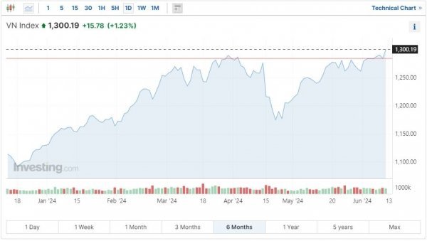 –2년여만에 최고치 기록 호찌민증시(HoSE) VN지수가 12일 1% 넘게 상승하는 호조로 1300선에 올라서며 2년여만에 최고치를 기록했다. VN지수는 전거래일보다 15.78포인트(1.23%) 오른 1300.19로 마감했다. VN지수의 1300선(종가기준) 회복은 지난 2022년 6월9일(1307.80) 이후 2년여만이다. 시가총액 상위30대 종목으로 구성된 VN30은 23.51포인트(1.80%) 오른 1331.81을 기록, VN지수보다 더 크게 올랐다. 이날 VN지수는 오전장에서 보합수준에서 소폭 등락하다가 오후장 들어 오름세로 …