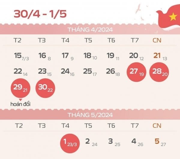 베트남이 추진중인 임시공휴일 지정 계획이 9부 능선을 넘었다고 인사이드비나지가 12일 보도했다. 노동보훈사회부는 11일 임시공휴일(29일) 지정에 대한 15개 부처•기관 의견수렴을 마무리짓고 계획안을 마련해 심의•의결을 위해 팜 민 찐(Pham Minh Chinh) 총리에 보고했다. 계획안은 오는 29일(월)을 임시공휴일로 지정하고, 대체 근무일을 5월4일(토)로 변경하는 내용을 담았다. 노동보훈사회부에 따르면 이날까지 13개 부처•기관이 근무일 조정 및 임시공휴일 …