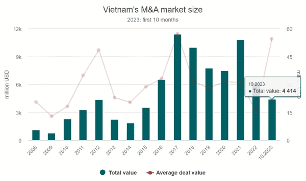 –10월까지 44억달러, 23% 하락 올들어 세계경제 침체 영향으로 10월까지 베트남의 인수합병(M&A) 시장이 크게 위축된 것으로 나타났다고 인사이드비나지가 30일 보도했다. 30일 국제회계법인 KPMG에 따르면, 1~10월 베트남의 M&A 규모는 44억달러로 전년동기대비 23% 감소했다. 다만, 거래건별 평균 거래액은 5450만달러로 3.5배 늘어났다. 주요 M&A로는 ▲미쓰이스미토모은행(SMBC)의 VP은행(VPbank 증권코드 VPB) 지분 15% 인수(14억달러) ▲아시아 부동산투자기업 ESR그룹(ESR Group)의 창고임대기업 BW산업(BW …