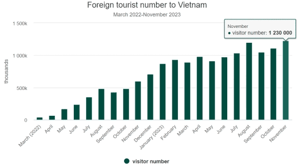 –작년 3월 전면재개후 최고치 베트남을 찾은 11월 외국인 관광객 수가 123만 명으로 지난해 3월 국제관광 전면 재개 이후 최고치를 기록했다고 인사이드비나지가 30일 보도했다. 이날 베트남관광총국(VNAT)에 따르면, 1~11월 외국인 관광객 수는 1120만여 명으로 올초 설정한 연간 유치 목표 800만 명을 훌쩍 뛰어넘었다. 이에 따라 관광당국은 최근 외국인 관광객 유치 목표를 1200만~1300만 …