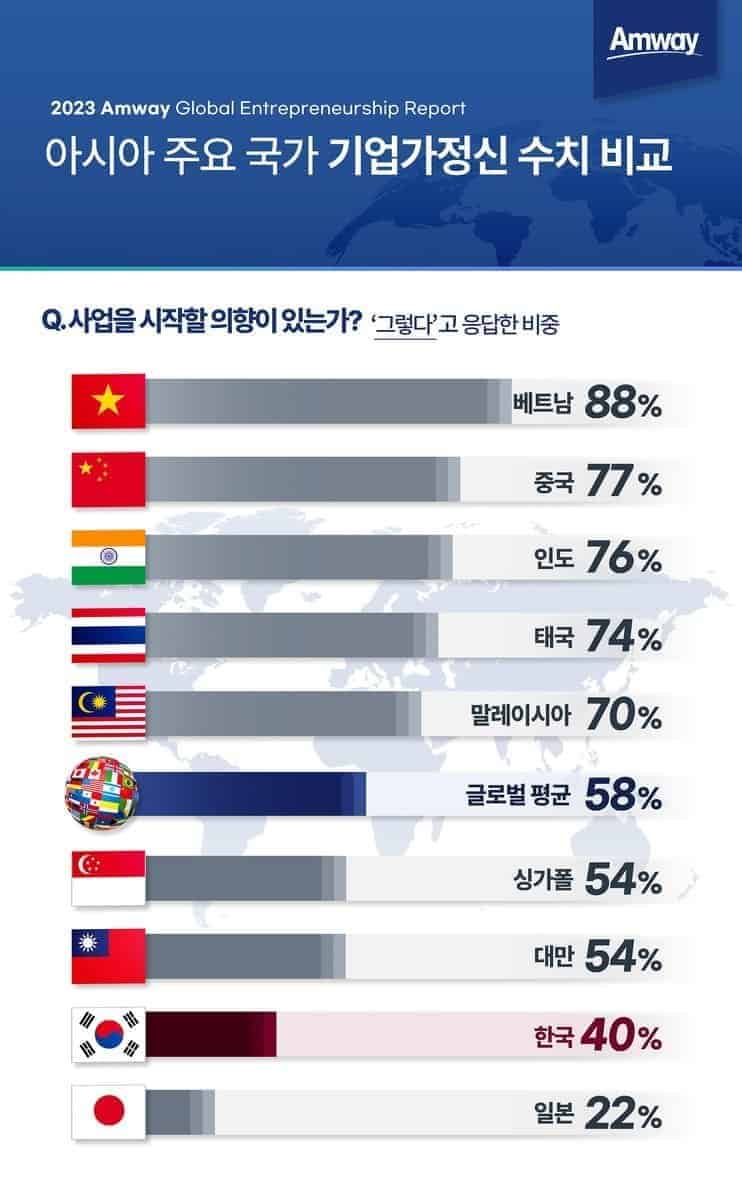 -베트남은 세계 최고로 조사 한국의 기업가정신이 여전히 세계 하위권에 머무른 것으로 나타났다고 연합뉴스가 13일 보도했다. 글로벌 건강전문기업 암웨이가 세계기업가정신주간(13∼19일)을 맞아 13일 발표한 2023 암웨이 글로벌 기업가정신 보고서에 따르면 기업가정신을 나타내는 주요 항목인 ‘사업을 시작할 의향이 있는가’에 대한 질문에 한국은 약 40%만이 ‘그렇다’라고 응답해 15개 조사국 중 최하위권인 13위를 기록했다. 독일(29%), …