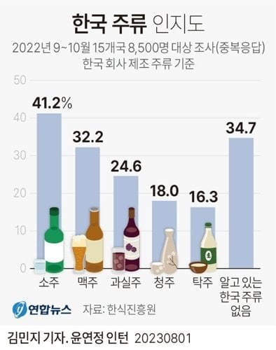 –동남아서 인지도 높아” 외국인이 가장 잘 알고 있는 한국 술은 ‘소주’인 것으로 파악됐다고 연합뉴스가 1일 보도했다. 한식진흥원은 지난해 9∼10월 15개국 8천500명을 대상으로 ‘해외 한식 소비자 조사’를 진행한 결과 이같이 나타났다고 1일 밝혔다. 조사에서 전체 응답자의 41.2%(중복응답)는 한국 술로 ‘소주’를 알고 있다고 답했다. 이 조사에서 ‘한국 술’은 전통주가 아닌 한국 회사가 …