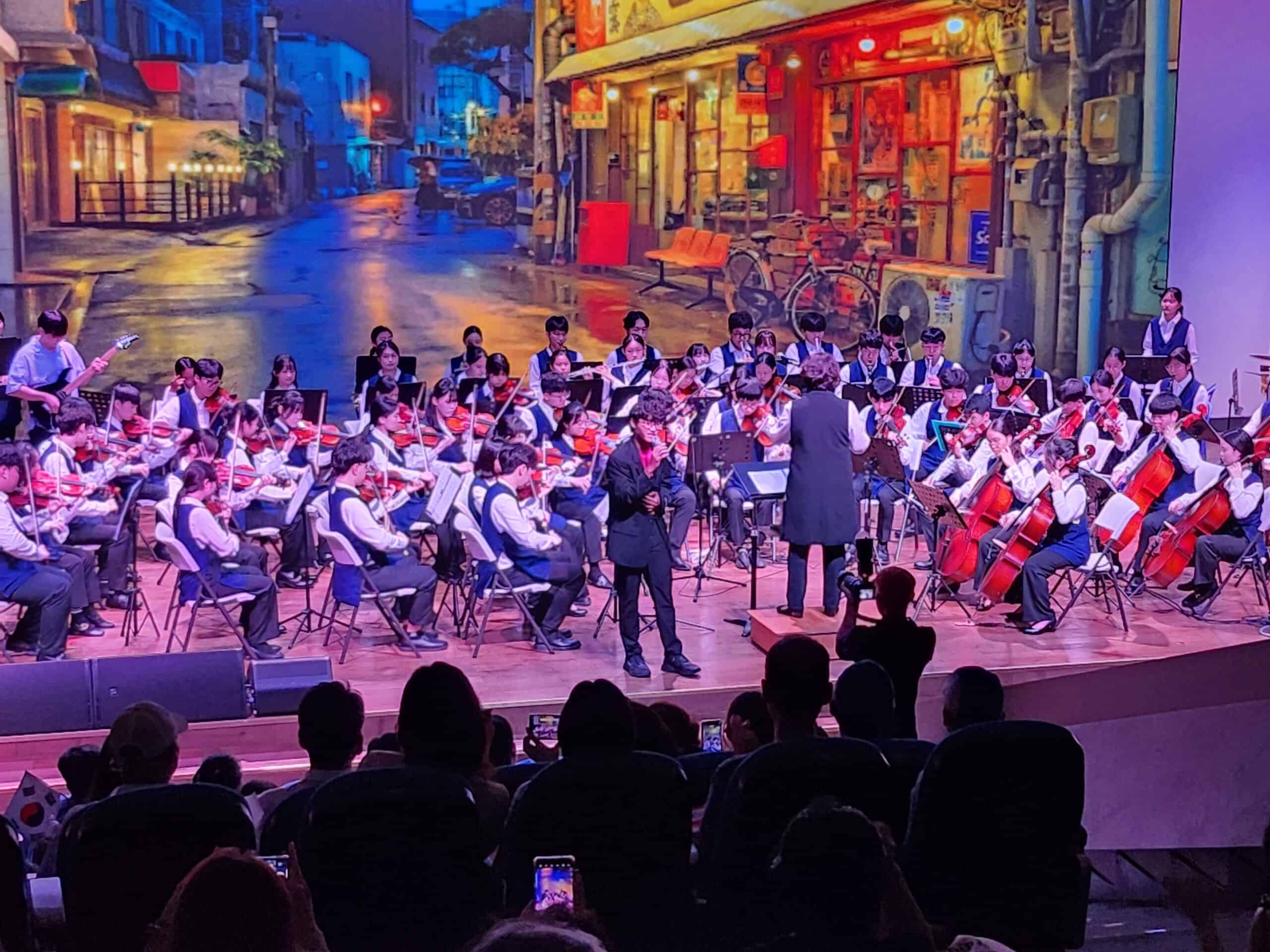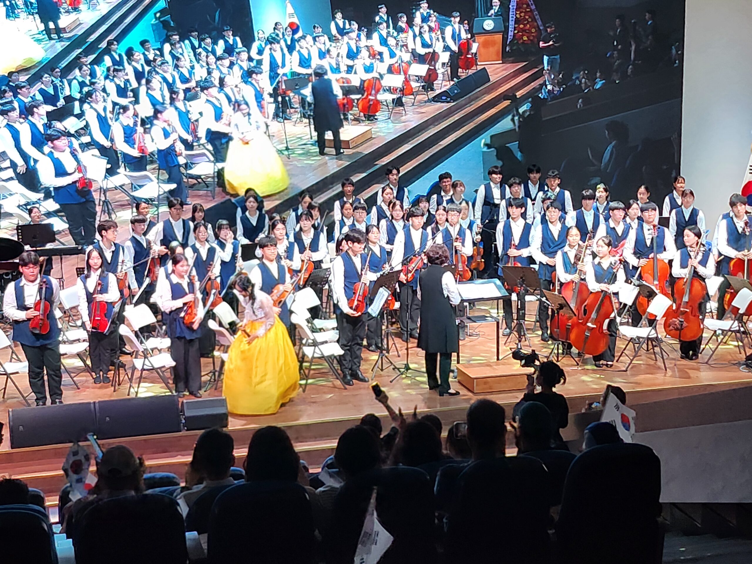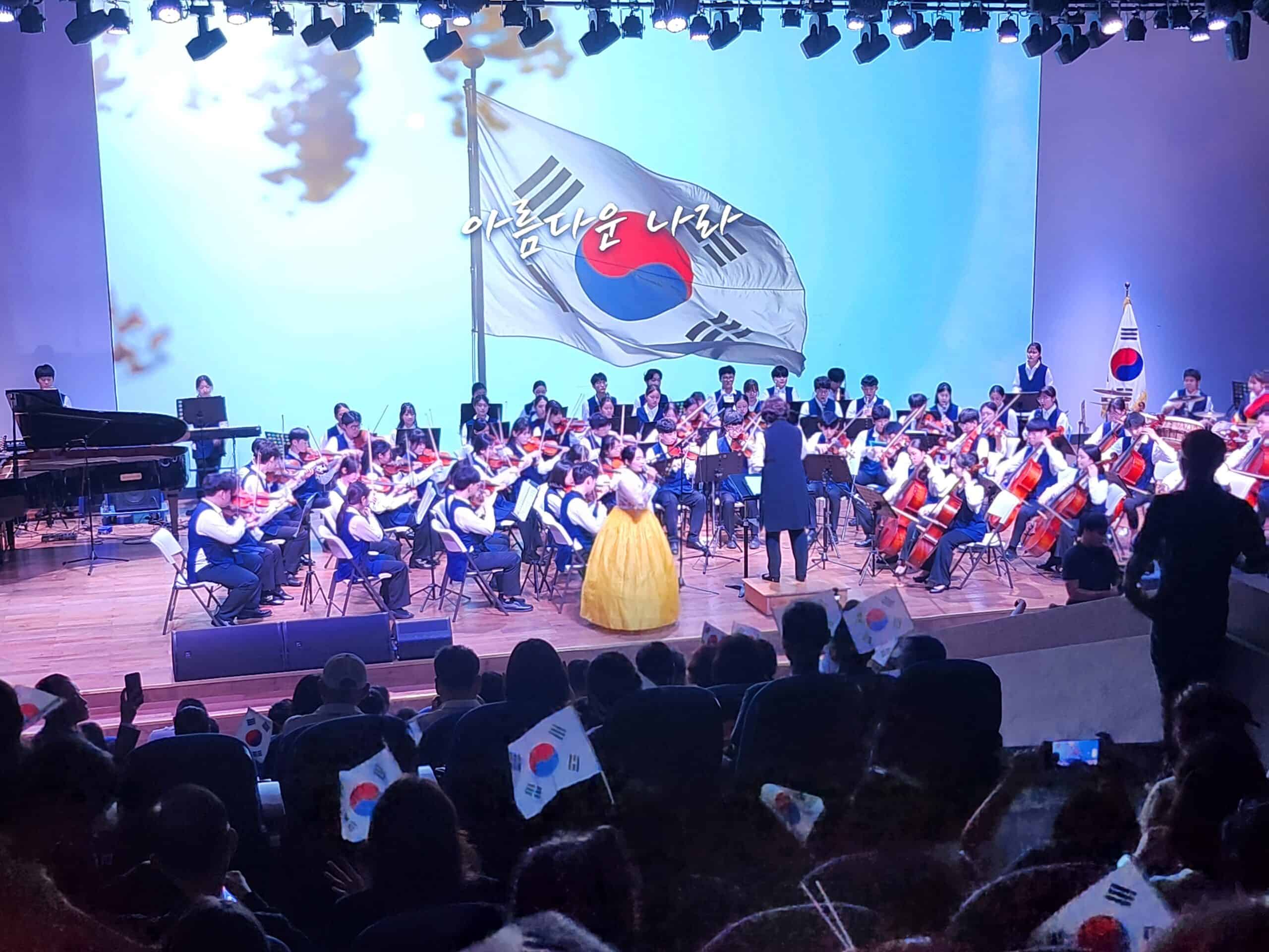 기념식 후에는 다채로운 축하 공연이 펼쳐졌다. 한국국제학교 초등부 학생들이 선보인 사물놀이는 힘찬 북소리와 징, 꽹과리, 장구의 울림으로 장내를 뜨겁게 달궜다. 한국국제학교 교향악단의 앙상블 연주도 이어져 관객들에게 장중하면서도 세련된 무대를 선사했다.