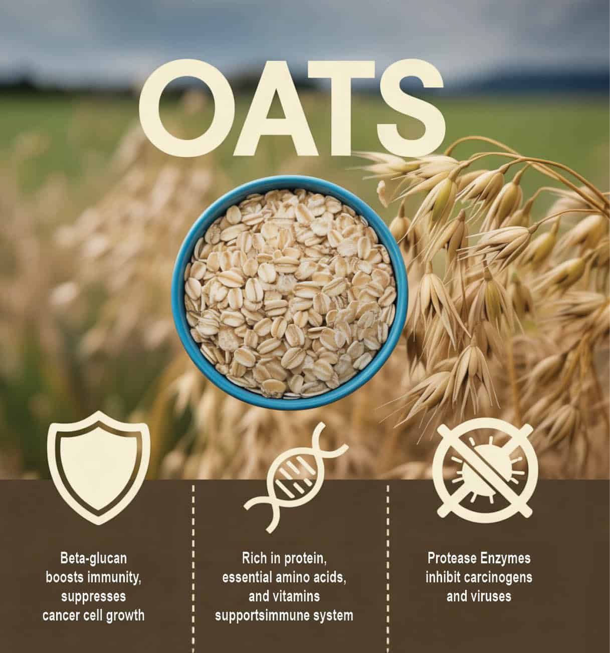 귀리에 다량 함유된 베타글루칸은 체내 면역력을 강화시키고 암세포의 증식과 생성을 억제하는 기능을 한다. 단백질과 필수아미노산, 각종 비타민 등이 풍부해 면역력 향상에 도움이 된다.