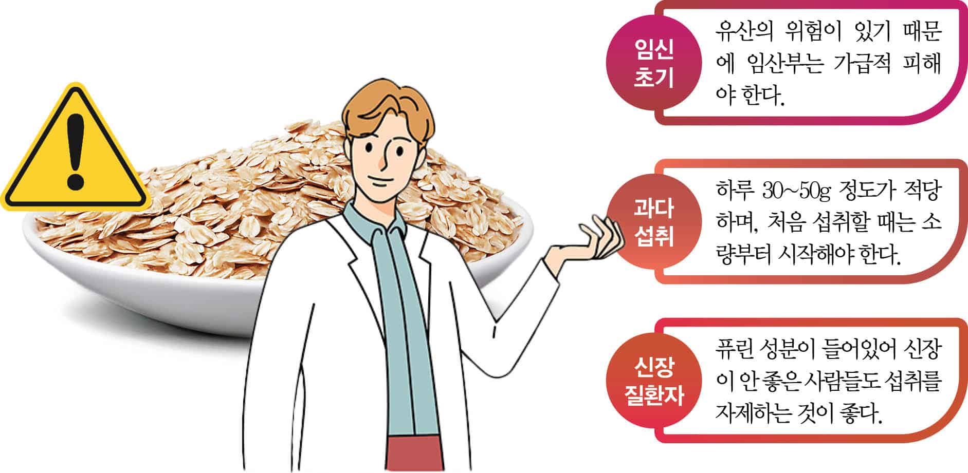 귀리는 고단백질이고 식이섬유가 풍부하기 때문에 과다 섭취를 하는 경우 복부팽만감 등이 생길 수 있어 적정량, 소량을 밥에 섞어서 섭취하는 것이 좋다.