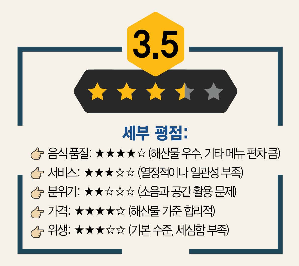 하지만 아직 넘어야 할 산이 많다. 무엇보다 서비스의 일관성, 공간 활용의 효율성, 메뉴 품질의 균등성에서 상당한 개선이 필요하다. 현재 수준으로는 해산물을 좋아하고 가격 대비 만족도를 중시하는 고객층에게는 충분히 추천할 만하지만, 특별한 날의 프리미엄 다이닝을 원하는 고객들에게는 아직 부족함이 있다.