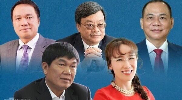 포브스 8월 세계 억만장자에 오른 베트남 기업 총수 5명. 왼쪽 상단부터 시계 방향. 호 훙 안 테크콤은행 회장, 응웬 당 꽝 마산그룹 회장, 팜 녓 브엉 빈그룹 회장, 응웬 티 프엉 타오 비엣젯항공 회장, 쩐 딘 롱 호아팟그룹 회장. (그래픽=VnExpress/Khanh Hoang)