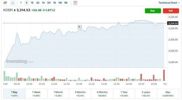 이날 코스피지수는 전거래일보다 54.48포인트(1.67%) 급등한 3314.53으로 마감, 단숨에 3300선에 올라서며 지난 2021년 7월6일(3305.21)을 넘는 사상최고치를 기록했다. 장중 코스피지수는 3317.77까지 상승해 2021년 6월25일(3316.08)의 기록을 깨며 장중기준도 최고치를 기록했다.