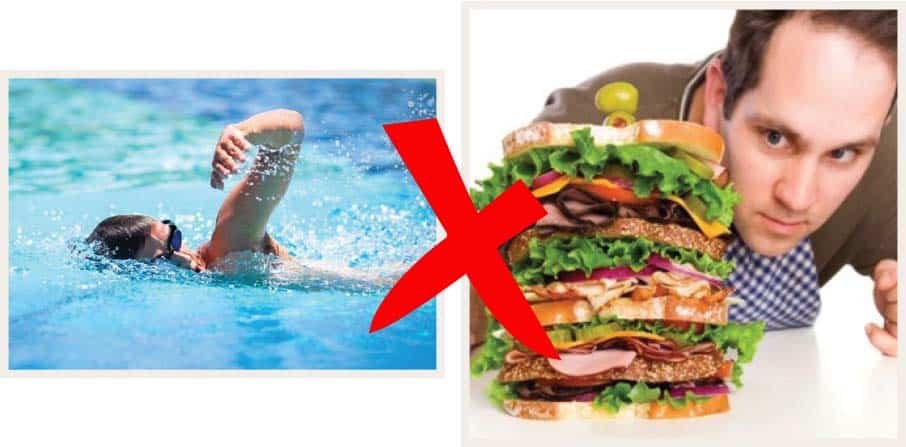 수영의 다이어트 효과를 가로막는 가장 큰 장애물은 운동 후 급격히 증가하는 식욕이다. 수영 후 허기짐은 다른 운동과 비교해 특히 강한 것으로 알려져 있다. 과학자들은 수영 후 허기짐의 원인을 두 가지로 분석한다. 첫째는 심부체온 변화다. 찬물의 특성으로 인해 심부체온이 낮아지면 지방 생성을 위한 재료 공급을 위해 허기짐을 발동시킨다는 것이다. 둘째는 호흡 문제다. 물속에서 충분히 호흡을 하지 못하는 수영의 특성으로 인해 산소를 충분히 태우지 못하는 ‘불완전연소’가 일어난다. 이 때문에 운동 후에도 산소를 지속적으로 태워야 하는 EPOC(Excess Post – exercise Oxygen Consumption) 효과가 일어나며, 이 과정에서 탄수화물을 원하는 허기짐이 발동한다. “이 요건을 해소하지 못하는 수영은 어쩌면 살을 더 찌우는 최악의 결과가 나올 수도 있다”고 한 영양학 전문가는 경고했다. “수영 후 허기짐과 ‘난 운동 했는데 이 정도는 괜찮겠지’하는 심리적 합리화로 인해 과식이나 폭식을 하게 되면 수영은 살을 빼기에 적합하지 않다는 잘못된 믿음이 생길 수 있다.”