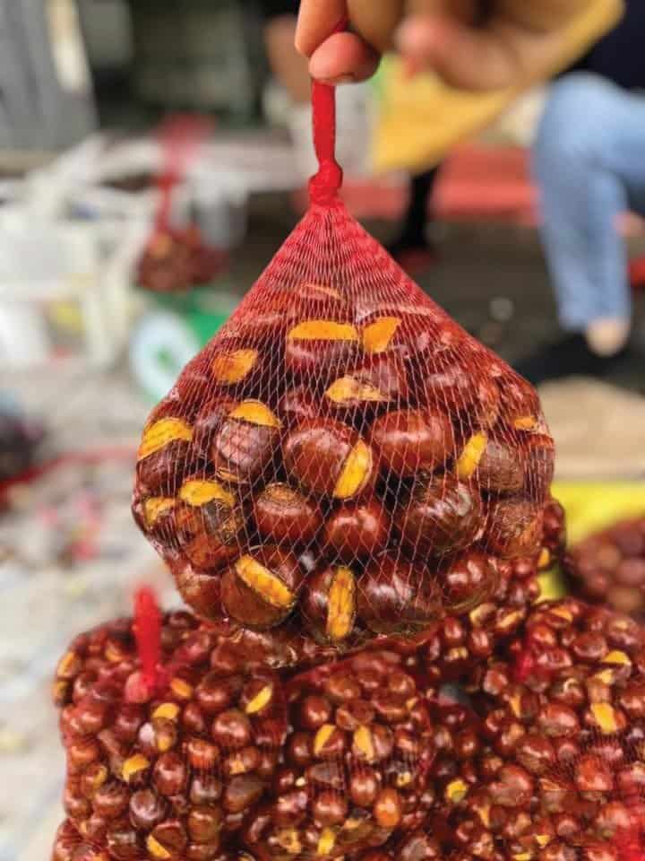 베트남에서 밤은 hạt dẻ라고 불리며, 현지산은 9~10월이 제철이다. 태국산 수입 덕분에 연중 구매가 가능하며, 가격은 일반 재래 시장에서 kg당 60,000~70,000 VND(약 3,000~3,500원) 정도다.