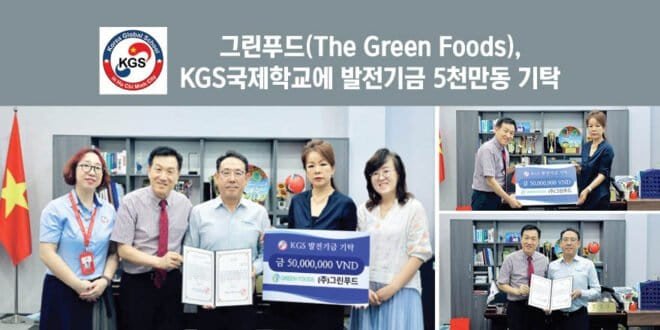 베트남 현지 식자재 전문업체 그린푸드(The Green Foods)가 KGS 국제학교(호치민캠퍼스)에 발전기금 5천만 동(약 250만원)을 기탁했다.