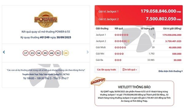 베트남 국영 로또사업자 비엣로트(Vietlott)는 9월 30일자 파워 6/55(Power 6/55) 추첨에서 잭폿(Jackpot, 1등) 당첨자 1명이 다낭에서 나왔다고 1일 밝혔다. 잭폿 당첨자가 나온 것은 지난 7월 이후 2개월여 만으로, 당첨금은 1790억여동(약 680만달러), 번호는 17-23-34-39-46-52 였다.