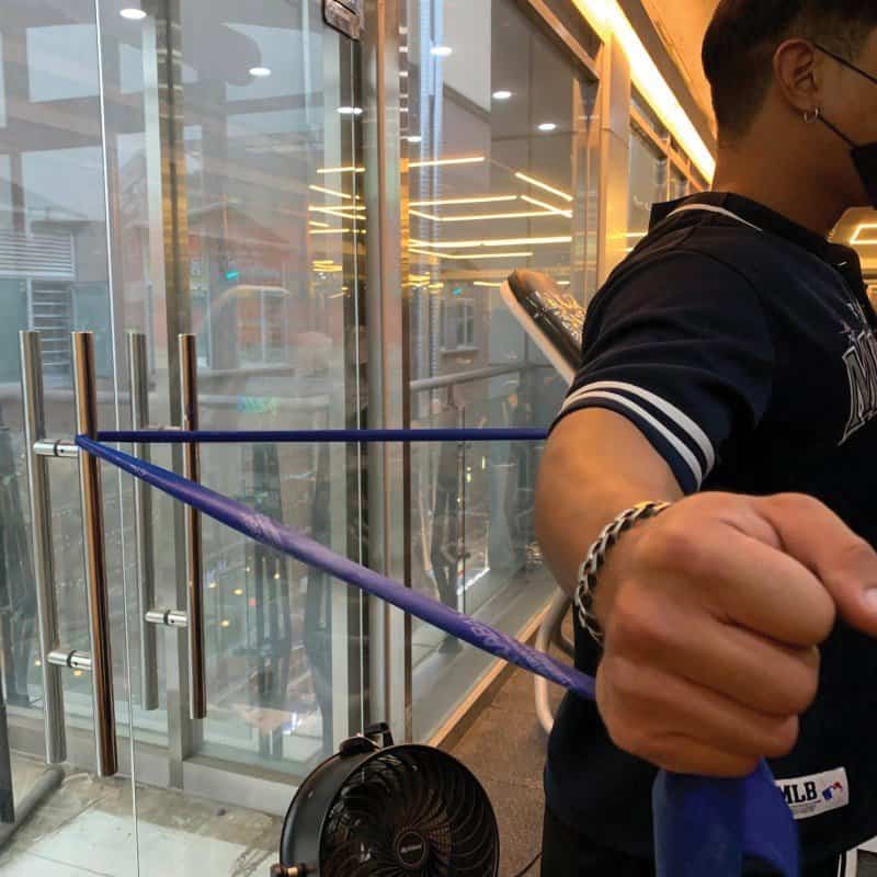 사이드 레터럴 레이즈는 어깨 운동의 정석이다. 발로 밴드를 밟고, 팔꿈치를 90도로 구부린 채 양옆으로 들어 올린다. 운동 전 밴드를 짧게 잡고 10초간 최대한 당겨 홀딩하면 근육에 혈류가 몰려 펌핑감을 극대화할 수 있다.