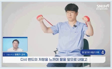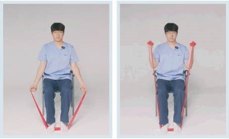 팔 앞으로 내밀기는 가슴 근육 운동이다. 밴드를 등 뒤 날개뼈에 놓고, 어깨 높이에서 팔을 앞으로 민다. 넷째, 양팔에 체중 싣기는 의자 팔걸이를 잡고 엉덩이를 들어 올리는 동작으로 삼두근을 강화한다.