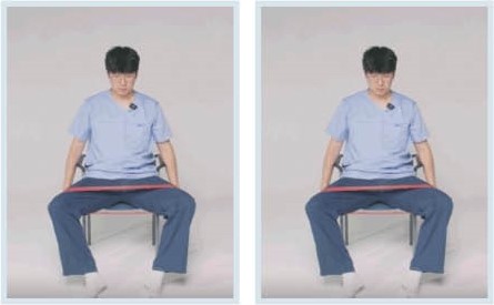앉아서 다리 벌리기는 밴드를 무릎 위에 고정하고, 다리를 양옆으로 벌렸다 모은다. 무릎 펴기는 밴드를 발목에 걸고 한쪽씩 번갈아 무릎을 편다. 서서 다리 벌리기는 발목에 밴드를 감고 옆으로 다리를 들어 올린다.