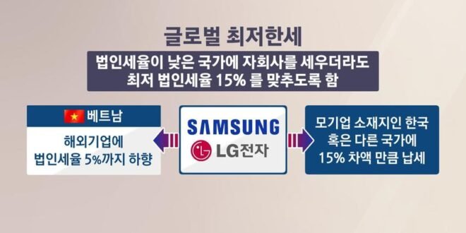 베트남 정부가 오는 15일부터 글로벌 최저한세(GMT·Global Minimum Tax) 제도를 본격 시행한다고 파이낸설뉴스지가 12일 보도했다. 15일 부터 적용되는 글로벌 최저한세는 다국적기업(MNE)에 15%의 최소 법인세율을 의무적으로 적용하는 제도다. 이에 따라 그동안 파격적인 조세 혜택을 기반으로 베트남에 투자해온 삼성전자와 LG전자 등 국내 대기업들의 베트남 현지에서의 세금 부담이 크게 늘어날 전망이다. 그동안 국내 기업들은 베트남에서 5~10% 정도의 세금을 적용받았다.