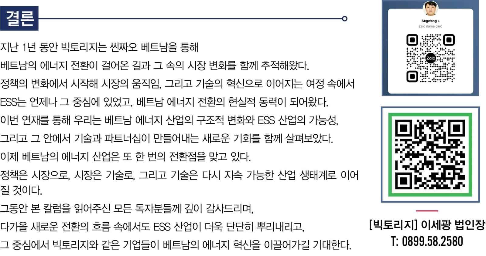 한국은 이미 ESS 산업의 조기 도입과 운영을 통해 축적된 실증 경험과 기술 기반을 갖추고 있으며, 이러한 경험은 베트남이 직면한 과제를 해결하는 데 실질적인 참고 모델이 되고 있다. 결국 빅토리지와 같은 기업들이야말로, 검증된 시스템과 운영 기술, 그리고 협력형 파트너십을 기반으로 베트남의 에너지 산업을 안정적이고 지속 가능한 생태계로 이끌 실행 중심의 핵심 주체로 자리할 것이다.