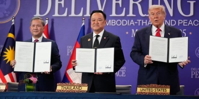 이날 아세안 정상회의 개최 장소인 말레이시아 쿠알라룸푸르에 도착한 트럼프 대통령은 아누틴 찬위라꾼(Anutin Charnvirakul) 태국 총리와 훈 마네트(Hun Manet) 캄보디아 총리, 아세안 의장국인 말레이시아의 안와르 이브라힘(Anwar Ibrahim) 총리와 함께 휴전 협정문에 공동 서명했다.