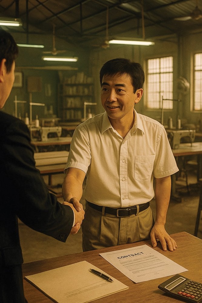 마침 제가 진출 초기 봉제 오더 중개업을 할 때 인연을 맺은 대형 베트남 공장에서 공장 규모를 줄인다는 얘기를 듣고 그 회사 사장을 무작정 찾아 갔습니다. 그리고 여권과 같이 제가 받을 수 있는 오더에 대한 서류를 내밀며, 정리하는 라인에 있는 기계의 인수를 요청했습니다. 기계 값은 매달 일정액으로 갚는 것으로 하고 보증금 없는 인수를 요청했습니다.