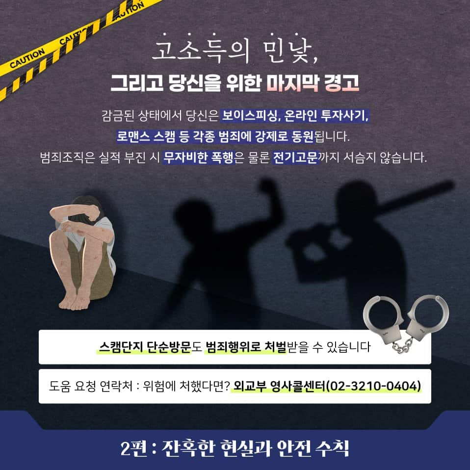 총영사관은 “감금된 상태에서 당신은 보이스피싱, 온라인 투자사기, 로맨스 스캠 등 각종 범죄에 강제로 동원된다”고 경고했다.