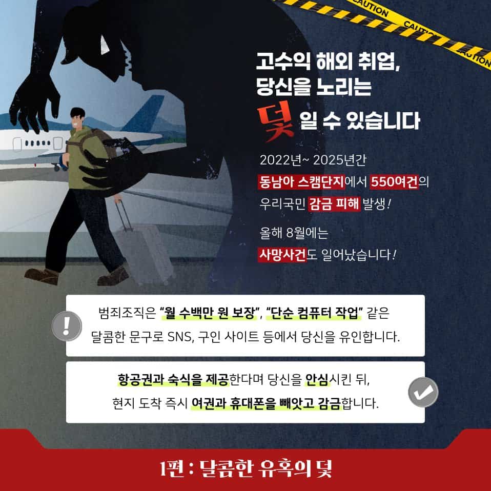 카드뉴스에 따르면 2022년부터 2025년까지 동남아 스캠단지에서 550여건의 한국인 강금(監禁) 피해가 발생했다. 올해 8월에는 사망 사건도 일어났다.