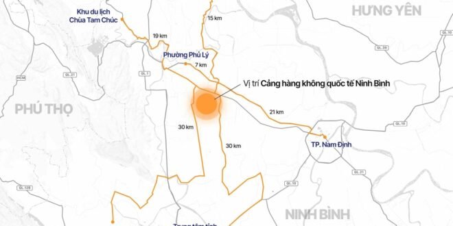 제안된 위치에서 푸 리까지는 약 7km, 흥옌 성 중심까지는 약 15km, 남딘시까지는 21km, 닌빈시까지는 30km 거리에 위치한다. 공항은 또한 타이 띰주 사찰 관광지와 약 19km, 바이딘 – 짱안 명소 군까지는 30km 떨어져 있다.