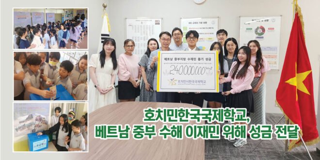 호치민시한국국제학교(교장 김명환)가 태풍 ‘갈매기’로 큰 피해를 입은 베트남 중부 지역 이재민들에게 따뜻한 손길을 건넸다. 학교는 지난 11월 28일 학생, 학부모, 교직원이 함께 참여한 모금 캠페인을 통해 단 하루 만에 2억 4천만 동(VND)의 성금을 모았다.