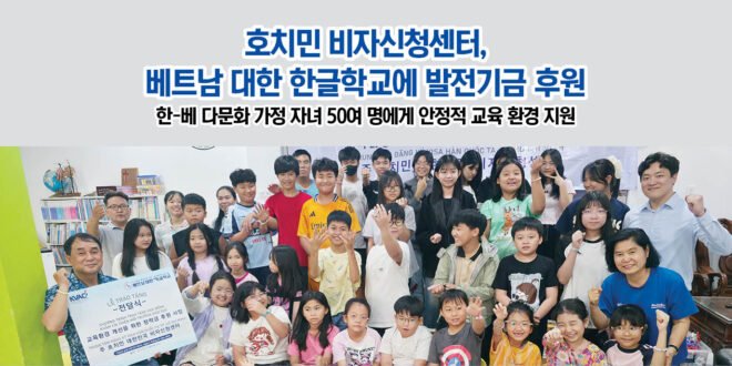 주 호치민 대한민국 비자신청센터(이하 호치민 비자신청센터)가 지난 6일(토) 호치민시 12군에 위치한 베트남 대한 한글학교(교장 이영식)를 방문해 발전기금 후원식을 가졌다.