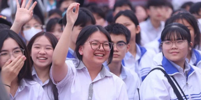 학생들이 2025년 쩐딘 고등학교에서 베트남 Thanh Niên 신문의 수능 상담 프로그램에 참여하고 있다.
