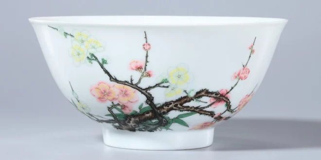 이 사발은 매우 얇은 것이 특징으로, 분홍색과 흰색 매화 문양이 그려져 있고 아래쪽에는 대나무 잎이 장식되어 있다. 전문가들은 필치가 정교하고 유려하며, 구도가 단순하고 우아해 옹정제 시대(재위 1722~1735) 도자기의 전형적인 양식이라고 평가했다.