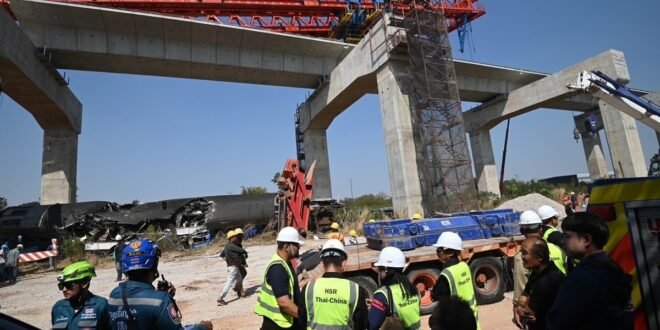 14일(현지시간) 오전 태국 중부 나콘랏차시마주 시키오 지역의 고속철 공사장에서 크레인이 붕괴, 공사장 아래 철로로 떨어지면서 수도 방콕에서 동부 우본랏차타니주로 향하던 열차의 2개 객차를 덮쳤다.