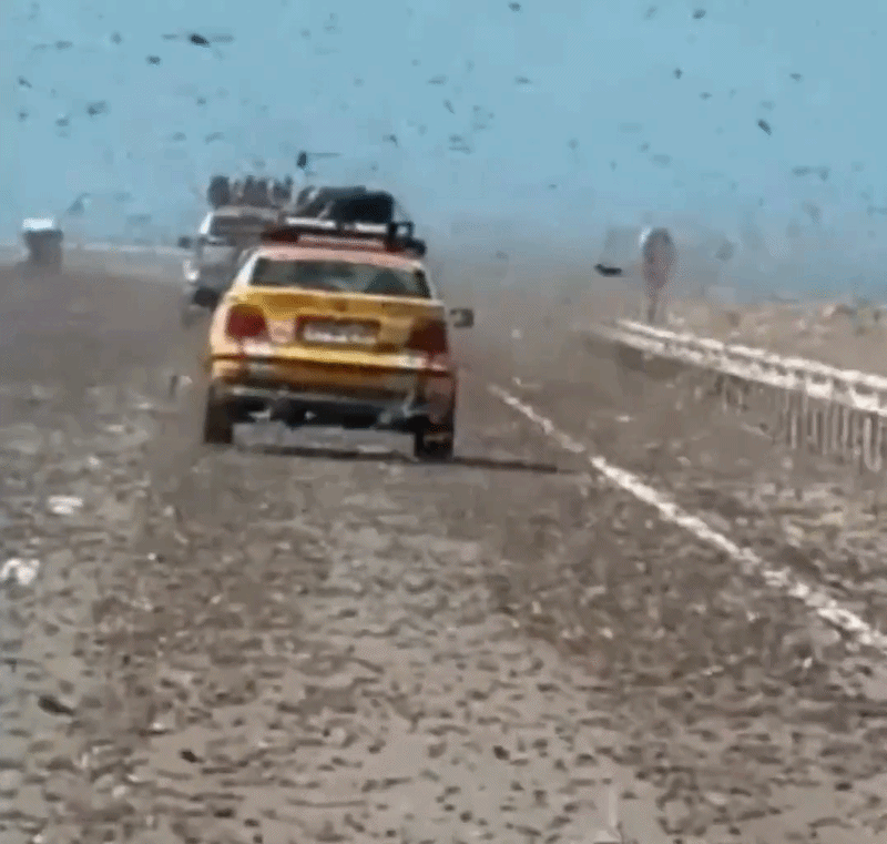 사하라 사막을 가로지르던 운전자들이 거대한 메뚜기 떼가 차량에 부딪히고 도로를 완전히 뒤덮는 장면에 직면해 공포에 떨었다.