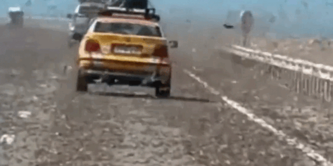 사하라 사막을 가로지르던 운전자들이 거대한 메뚜기 떼가 차량에 부딪히고 도로를 완전히 뒤덮는 장면에 직면해 공포에 떨었다.