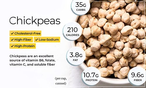 병아리콩은 고영양 식품으로 특히 단백질과 섬유질이 풍부하며 여러 비타민과 미네랄도 많다. 삶은 병아리콩 100g은 무게 대비 물 60%, 탄수화물 27%, 단백질 9%, 지방 3%를 함유하고 있다.
