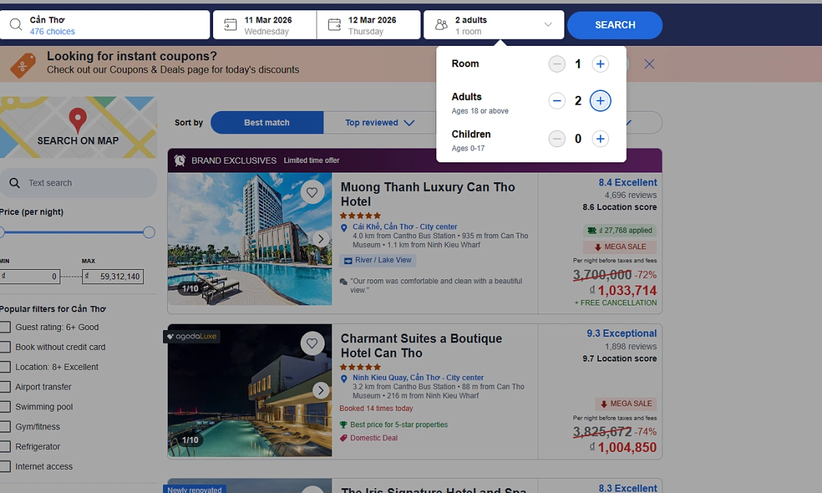 3일 현지 매체 브이엔익스프레스(VnExpress)와 여행 커뮤니티 등에 따르면, 많은 글로벌 호텔 예약 사이트에서 1인실과 2인실의 가격 차이가 없거나 미미한 경우가 많다. 이때 인원수를 ‘2’로 설정해 예약하면 다음과 같은 실질적인 이득을 얻을 수 있다.