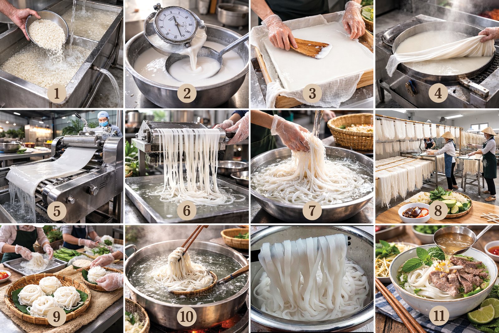 전통 방식에 따르면 먼저 불린 쌀을 곱게 갈아 물처럼 만든 뒤, 이것을 촘촘한 거름망에 담아 수분을 제거하고 숙성시킨다. 숙성이 끝나면 다시 물을 가해 적절한 농도의 반죽을 만들고, 이를 스팀 찜기 위에 얇게 펴서 쪄낸다. 쪄낸 반죽은 대나무 쟁반에 올려 햇빛에 말린 다음 가공한다. 얇게 떠내면 라이스 페이퍼(bánh tráng)가 되고, 두텁게 떠서 칼로 자르면 넓적한 쌀국수 면이 된다. 가는 면을 만들 때는 쌀가루 익반죽을 구멍 뚫린 체에 밀어 끓는 물 속으로 짜내는 방식을 쓰는데, 이 역시 상당한 체력과 기술을 요구하는 작업이다.