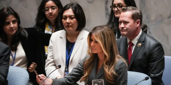 멜라니아 트럼프 미국 영부인이 2일(현지시간) 뉴욕 유엔 본부에서 ‘분쟁 상황 속 어린이와 교육’을 주제로 열린 유엔 안전보장이사회(안보리) 회의를 주재했다. 현직 국가 정상의 배우자가 안보리 회의를 직접 주재한 것은 역사상 이번이 처음이다.