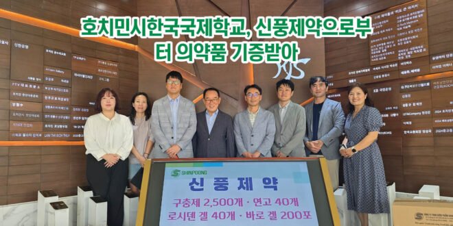 호치민시한국국제학교(교장 김명환)는 신풍제약(신풍대우파마베트남 법인장 홍상기)이 3월 9일 학생들의 건강한 학교생활을 지원하기 위해 구충제 2,500개와 연고 40개, 로시덴 겔 40개, 바로 겔 200포를 기증했다고 밝혔다.