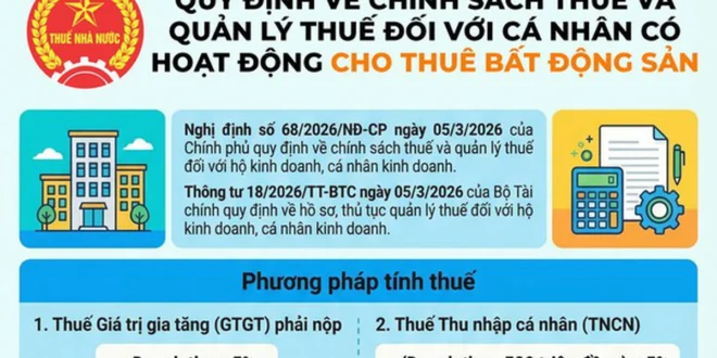 시행령 제68/2026/ND-CP호 및 재정부 통달 제18/2026/TT-BTC호에 따르면 개인 부동산 임대 사업자는 부가가치세(GTGT)와 개인소득세를 모두 납부해야 한다. 부가가치세는 임대 총수입의 5%가 적용된다. 개인소득세의 경우 연간 임대 총수입에서 5억 동을 먼저 공제한 뒤, 나머지 금액에 대해 5%의 세율을 적용한다.