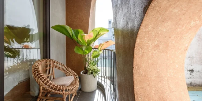 각 층을 잇는 계단은 빛의 흐름을 방해하지 않도록 가느다란 흰색 철제 난간과 목재 손잡이를 사용했다. 침실은 하단 LED 조명이 내장된 목재 침대와 황금빛 특수 도장 벽면으로 마감해 고급스러움을 더했다. 상층부 발코니에는 라탄 의자와 대형 화분을 배치해 도심 전경을 즐기며 휴식할 수 있는 공간을 마련했다.