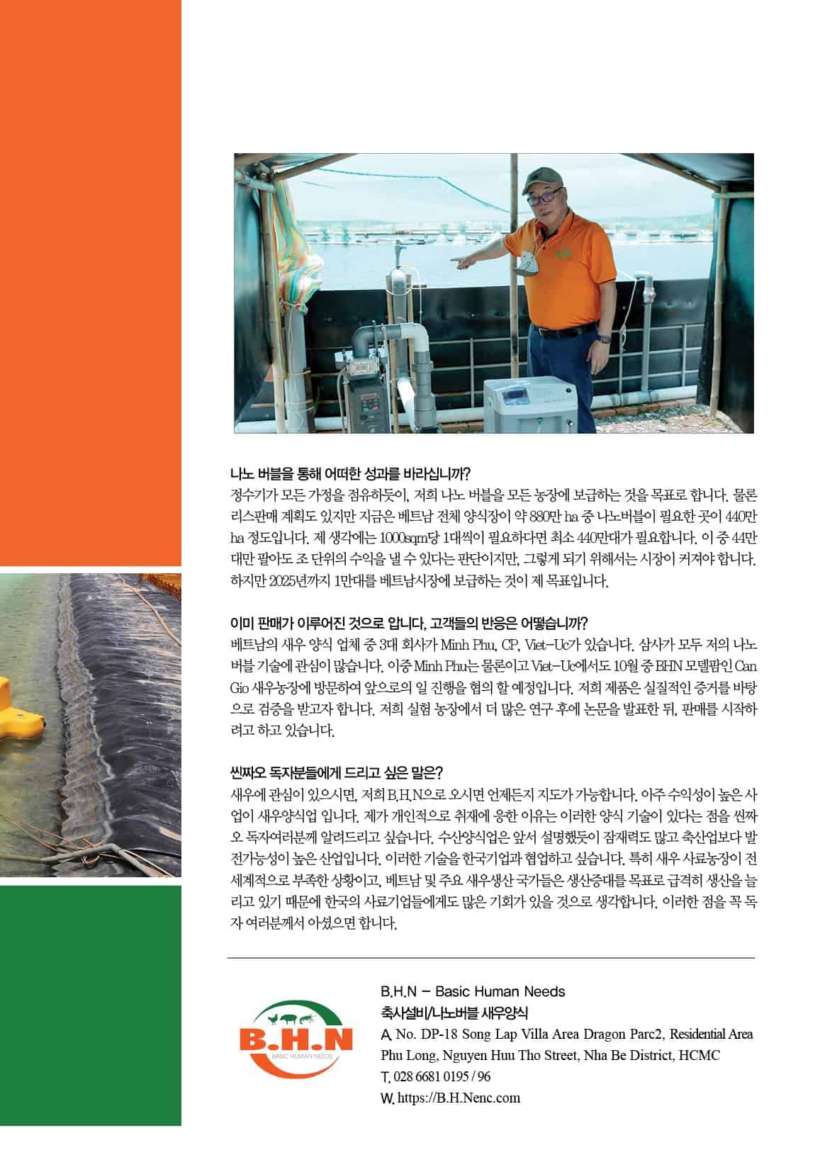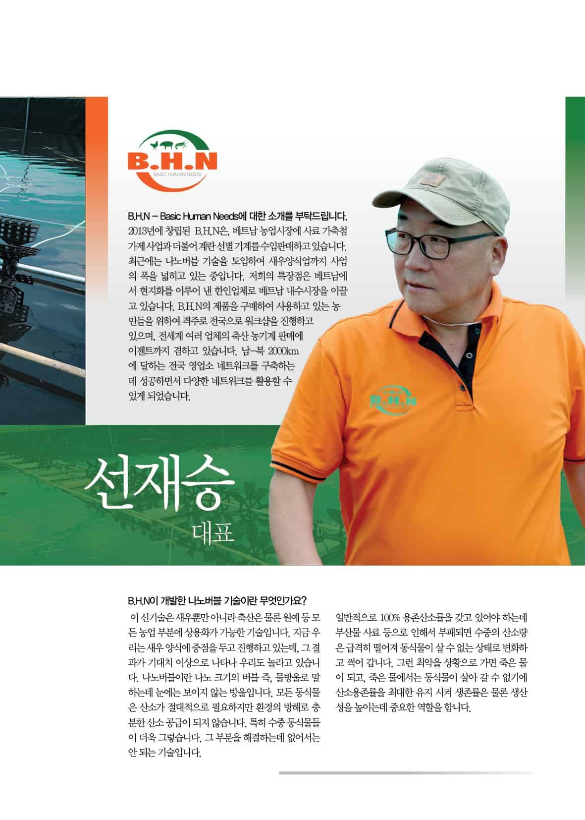 2013년에 창립된 B.H.N은, 베트남 농업시장을 블루오션으로 바라본 선재승 대표가 사료 가축영양제 사업과 더불어 계란 분류 기계를 제조하고 있다. 최근에는 새우양식업까지 진출하며 사업의 폭을 넓히고 있다. B.H.N은 베트남에서 현지화를 이루어 낸 한인업체로 베트남 내 시장을 이끌고 있다. B.H.N의 제품을 구매하여 사용하고 있는 농민들을 위하여 격주로 전국으로 워크샵을 진행하고 있으며, 이거에 더하여 전세계 여러 업체의 축산 농기계 판매 에이젠트까지 하고 있으며, 남-북 2000킬로미터에 달하는 전국 영업소 네트워크를 구축하는데 성공한 유망 업체이다.