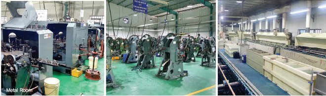 베트남 내, 웨빙공장에서는 웨빙(나일론, 쟈가드, 폴리), 지퍼, 제직, 염색을 다루고 있고 메탈공장에서는 메탈장식류 (철, 아연, 신주, 사출 등) 금속 부자재를 생산부터 도금, 코팅 전 공정으로 제품의 품질 및 납기에 최선을 다하고 있습니다.