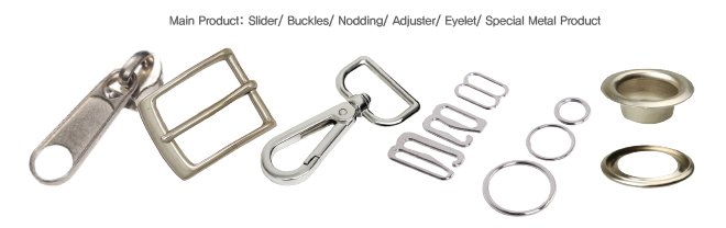 위의 웨빙 제품은 주로 배낭, 핸드백 등에 쓰이고 메탈장식류 제품들의 경우는 골프백, 일반가방, 신발 등에 활용되고 있습니다. 그외 특수 제품의 경우에는 주문 제작과정을 통하여 생산이 이뤄지고 산업자재 등에서 주로 활용되고 있습니다.