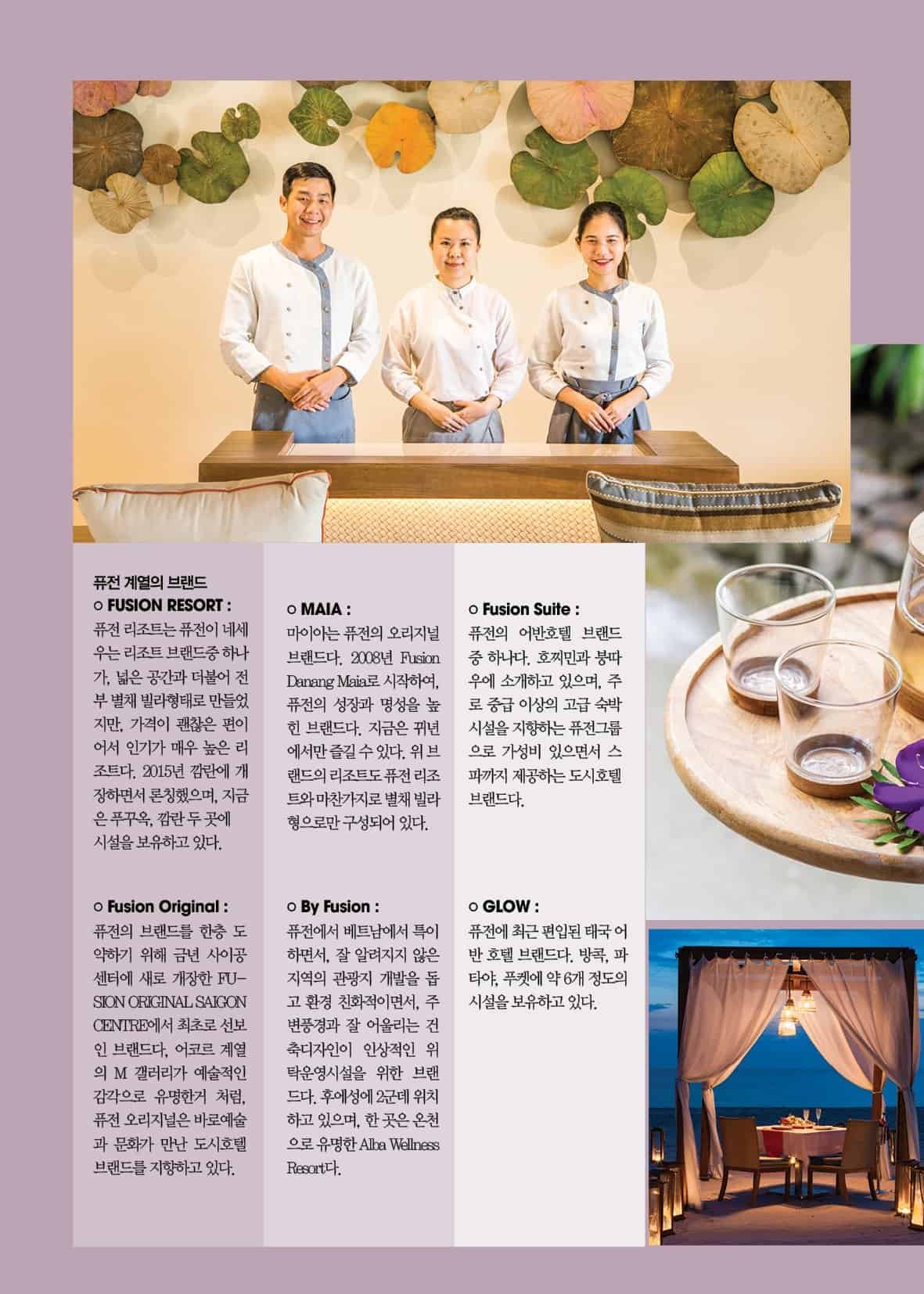 퓨전호텔그룹은 베트남과 유럽합작의 성공 스토리다. 퓨전은 세레니티 홀딩스라는 이름으의 부동산 회사로 2002년 시작되었다. 2006년 네덜란드인인 Marco van Aggele가 2006년에 회사에 조인 하면서 변화를 맞게 된다. 이때부터 본격적으로 고급리조트 및 호텔 업계에 진출하게 되고, 2008년 All-spa Inclusive 컨셉이라는 모토하에 베트남 다낭에 Fusion Maia 지금의 TIA 리조트를 오픈하면서 성장을 시작하게 된다.