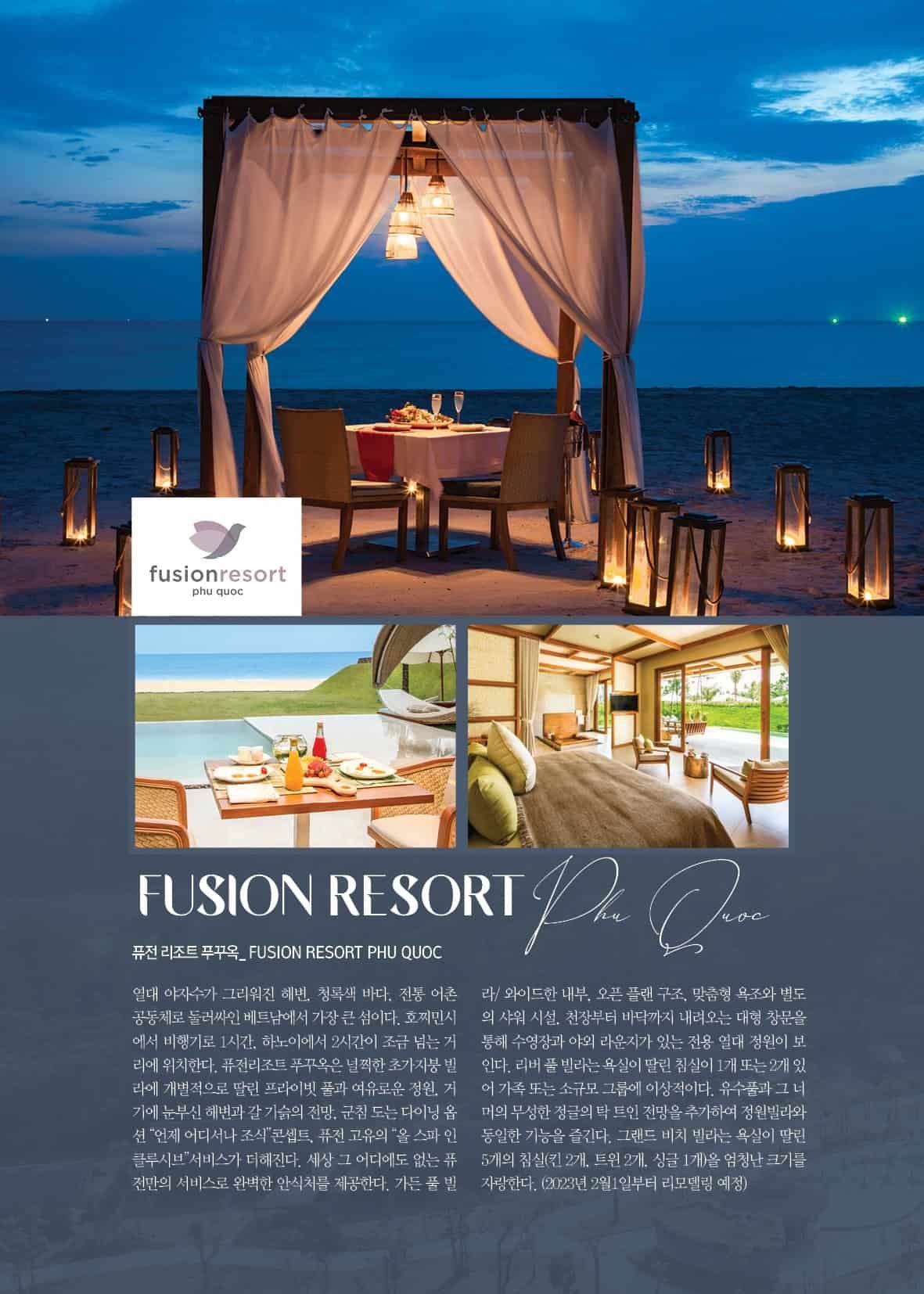 퓨전의 특징은 고객의 웰빙을 강조한다는 점이다. 특히 숙면과 마사지를 중요하게 여겨서, 다른 호텔에서는 돈을 내야 하는 마사지 서비스를, 퓨전계열 호텔에서는 무료로 제공하며, 대형 침대로 숙면 속에 편안한 휴식을 제공하는 퓨전만의 독특한 서비스로 명성을 얻었다. 퓨전은 이후, 뀌년, 깜란, 붕따우, 후에, 호찌민에 진출하며 최고의 호텔 & 리조트로 명성이 높아지고 있다.