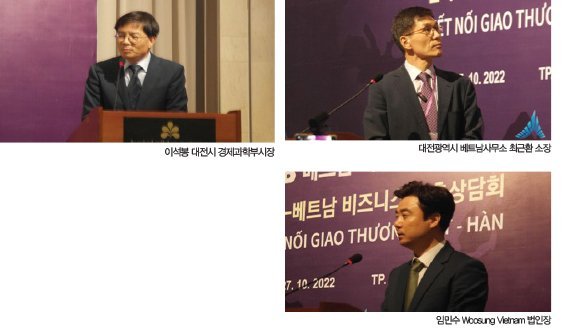 이석봉 대전시 경제과학부시장은 축사를 통해 “대전.충청지역 중소벤처기업들의 우수한 기술과 제품이 베트남에 널리 알려져 양국 발전의 신기원이 되기를 기원한다”고 강조했다. 이어서 대전광역시 베트남사무소 최근환 소장은 <베트남 투자환경과 시장전망> 주제발표를 통하여 베트남 투자 매력과 2023년 베트남 시장 전망을 발표하였다. “이번 행사는 도내 수출 중소기업들이 베트남 시장을 개척하고 확장하는 계기가 될 것”이라고 말했다.