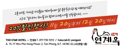 연계옥에서는 오픈기념 이벤트로 11월 20일부터 12월 20일까지 20%할인 행사를 진행한다. 만일 더 스타호텔의 투숙객의 경우라면 추가10% 할인이 적용되어 가성비 최고의 푸짐함으로 마음껏 즐길 수 있다.